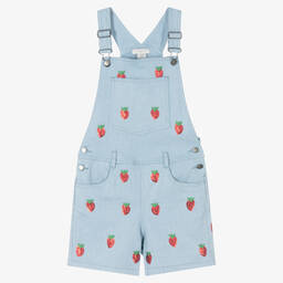 Blue short dungarees for teen girls by Stella McCartney Kids, made in soft organic cotton denim. With a casual look, they are beautifully embroidered with colourful flowers and fruits. They have button fastenings on the sides and adjustable popper fastening shoulder straps. There are useful back pockets.