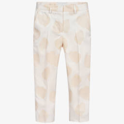 Organic cotton trousers for teen boys by Stella McCartney Kids, in a pale shade of green. Super comfortable in a twill weave, these relaxed-fit trousers have cuffed ankles, zipped front pockets and a logo label on the back, adding that signature branded detail. The waist is elasticated and adjustable with drawstrings for comfort. The Stella McCartney fit can be quite small so choose a size up if you want room to grow.