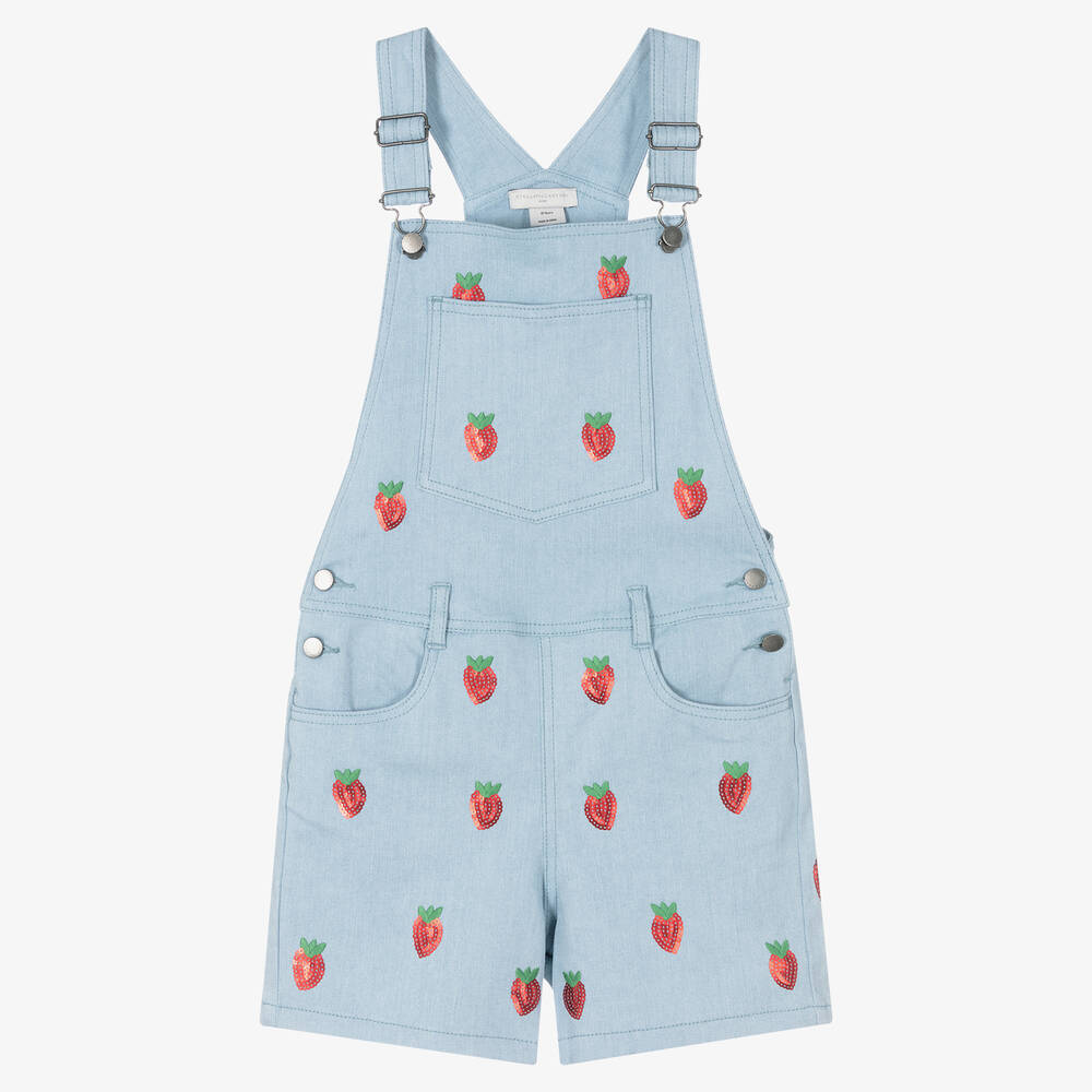 Patterned in eye-catching red sequinned strawberries, these pale blue dungaree shorts for teen girls are by Stella McCartney Kids. They are made in soft stretch denim and fasten with branded button fastenings on the sides. The shoulder straps are adjustable and fasten with metal clips and matching branded buttons. There are useful pockets on the front and back.
