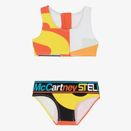Teen girls geometric logo print bikini from Stella McCartney Kids, in red, yellow, orange and black. This vibrant, eye-catching design is made in silky, stretchy recycled fabric with UPF50+. The top has an exposed yellow zip fastening on the back with a branded pull and the bottoms have an elasticated waist with bold rubberised logo lettering for an unmistakable designer finish. The Stella McCartney fit can be quite small so choose a size up if you want room to grow.