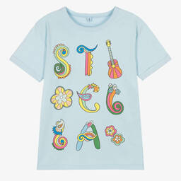 A logo-inspired ivory T-shirt for teen girls by British designer Stella McCartney Kids, crafted from soft organic cotton jersey. Symbolic of the brand, the logo print on the front is uniquely designed with retro-style motifs including a striped guitar and patterned flowers. It has a ribbed crew neck and turn-up sleeves for casual styling. The Stella McCartney fit can be quite small so choose a size up if you want room to grow.