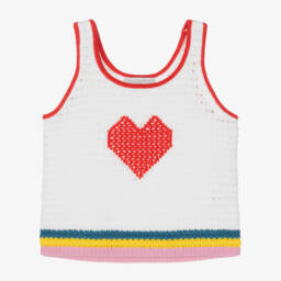 Teen girls white crochet knit top by Stella McCartney Kids, featuring a striking red heart motif on the front. This stylish and casual top is crafted from soft organic cotton knit with vibrant red trims. The hem is adorned with colourful stripes in pink, yellow, and blue, adding a playful touch. Be aware, the fit is quite small, so consider sizing up for a comfortable fit. Limited quantities available.
