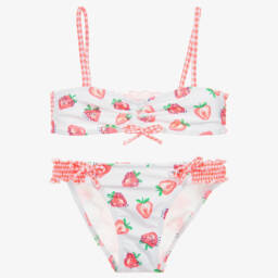 Cute neon pink bikini for girls by Sunuva, with a colourful Snoopy and Woodstock print. Smooth, stretchy and fully lined, it has a sun protection factor of 50+, validated by The British Skin Foundation. It has striped trim detail with wooden beads.