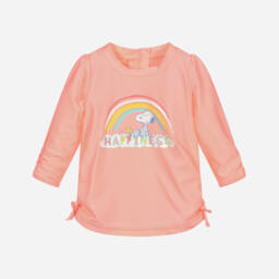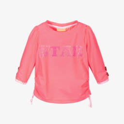 In vibrant pink and white, a striped swim top for teen girls from Sunuva with a beautiful blue flamingo print on the front. Made in stretchy recycled fabric, this long-sleeved rash vest has pretty ruched detail on the cuffs and hem, with decorative coconut buttons and tassel trims in pink and blue.