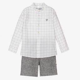 Super cute cotton shorts set for baby girls by traditional French brand Tartine et Chocolat. The ivory bodysuit is made in comfortable jersey, with a ruffled voile collar trimmed in lace and gently elasticated, frilled cuffs. It fastens on the front and between the legs with easy-to-use poppers for speedy dressing. The beige, brushed cotton shorts have a houndstooth pattern, with pretty flowers on the hand-smocked and embroidered waist. Full in shape and beautifully comfortable, the frilled, button-fastening shoulder straps are adjustable for a good fit. The cuffs are gently elasticated for comfort and there are popper fastenings between the legs for speedy dressing.
