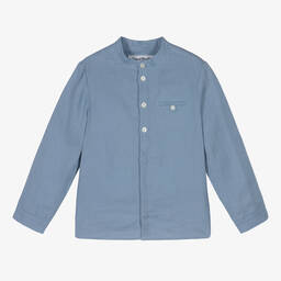 Grey-green collarless shirt for boys by Tartine et Chocolat. Cool and comfortable, this lightweight linen shirt has a faux chest pocket and branded button fastenings on the front.