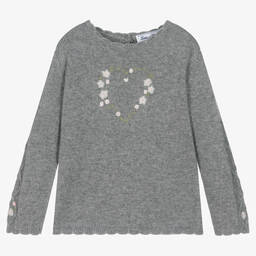 Beautifully soft and cosy for girls, this grey jumper from French label Tartine et Chocolat is knitted in soft wool. Ivory embroidered flowers on the front and cuffs add a stand-out look to this long-sleeved style. Designed in a relaxed fit with raglan sleeves and classic ribbed trims, it has a pearlised logo tab on the front hem to complete the designer look.