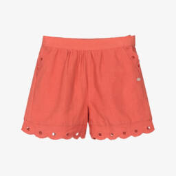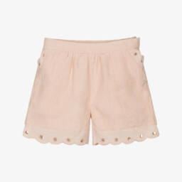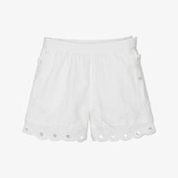 Ivory scalloped shorts for girls by Tartine et Chocolat offer a blend of elegance and comfort in lightweight linen. Perfect for warm spring and summer days, these charming shorts feature delicate scalloped trims with intricate eyelet embroidery. Practical slanted front pockets and an adjustable waistband ensure a snug fit, while a side zip fastening adds ease of wear. Enjoy the luxury of these unique shorts, but act fast—limited quantities available.