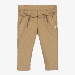 Deep red trousers for little girls, by Tartine et Chocolat. Made from fine cotton needlecord, they have sweet bows on the front and a mother-of-pearl logo under one front pocket. They are lined with soft and stretchy cotton jersey for comfort.