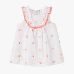 Girls white floral frock by Tartine et Chocolat features a delightful floral pattern in white, orange, and green. Crafted from soft plumeti cotton, it boasts a traditional smocked neckline with charming floral embroidery. The lightweight voile lining ensures comfort, while a concealed zip at the back allows for easy dressing. Perfect for spring and summer outings, this dress is available in limited quantities. Act fast to bring a touch of elegance to any occasion.