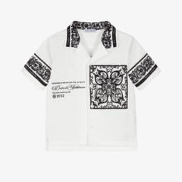 Smart white linen shirt by luxury brand, Dolce & Gabbana for teen boys. Smooth and lightweight with a natural weave, this relaxed tailored design features a script DG logo embroidered at the chest in tonal white viscose. Additional style details include a pointed collar and mother-of-pearl button fastenings down the front and at the cuffs.