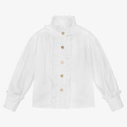 Teen girls off-white cotton blouse by British brand Angel's Face. With a high neck, this vintage-style piece is detailed with embroidered ruffle trims on the collar, neckline and placket. It is made in soft poplin and fastens with gold, heart-shaped buttons. These can also be seen on the barrel cuffs for a smart look.