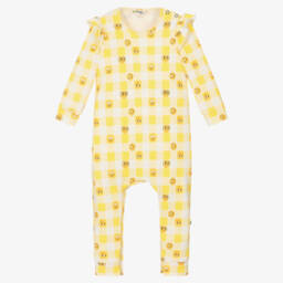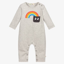 A blue and ivory romper for baby boys by British brand The Bonnie Mob, knitted in super soft organic cotton. This playful babygrow is patterned in a gingham check, with an adorable smiling face embroidered on the chest. There are button fastenings on the shoulder and between the legs to make changing easier.