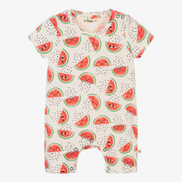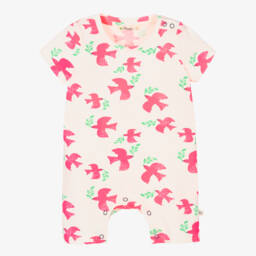 Ivory shortie for baby girls by The Bonnie Mob, made in soft, organic cotton jersey. Cool and comfortable, it is patterned in an all-over neon pink and green dove print for a vibrant and girly look. It has popper fastenings on one shoulder and between the legs for easy dressing and quick changing.