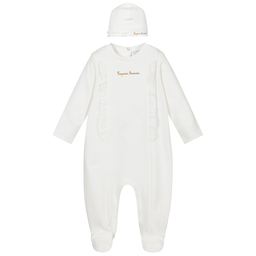 Baby girls white babygrow by THE MARC JACOBS, patterned with black polka dots and the brand's logo. Made in comfortable cotton jersey and trimmed in bright pink, it has The Mascot logo appliquéd on the chest in pink, with adorable matching 3D motifs on the feet.