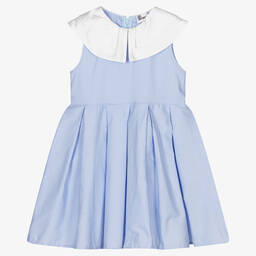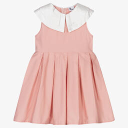 Girls black sleeveless dress by The Tiny Universe, made in lightweight cotton poplin. It has a layered ivory satin collar, a white logo patch on the back, and box pleats on the skirt. The skirt has a cotton lining with a layer of tulle for extra volume and the dress fastens with a concealed back zip.