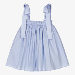 Lovely for both smart and casual occasions, this cornflower blue cotton dress for girls is by Swedish brand The Tiny Universe. It is made and lined in soft poplin, with a tulle netting in between for a dramatic volume. Pretty and stylish, it is elasticated around the chest and has silky satin straps to tie into a bow on each shoulder.