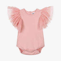 Dusky pink bodysuit for little girls by Swedish brand The Tiny Universe. Made in soft organic cotton jersey, there are popper fastenings on the back and between the legs, so when worn as a top it never becomes untucked. To add a touch of glamour to this casual style, it has voluminous tulle sleeves and a tonal patch logo on the back.