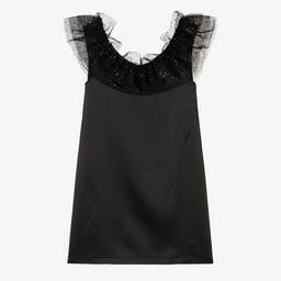 Pretty pink satin dress for girls by The Tiny Universe, with a statement tulle ruffle around the neckline, embellished with rose gold sequins. Soft and silky, the A-line shape and low back allow it to slip easily over the head. Finished with a small pink designer logo patch on the back, this lovely dress is ideal for a special occasion.
