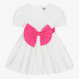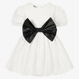 Lovely for a special occasion, this off-white cotton dress for girls is by The Tiny Universe. For a dramatic finishing touch, it comes with an elasticated belt, decorated with an eye-catching black satin bow, detachable with poppers and velcro. Made in soft poplin, it has puffed short sleeves and a full, box-pleated skirt with cotton lining and tulle underlayer in between for extra volume. There is a logo badge and a neat, concealed zip fastening on the back.