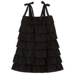 Girls white cotton poplin dress by The Tiny Universe, with layered ruffles. It has shoulder straps that tie in a bow and the bodice is elasticated at the top.