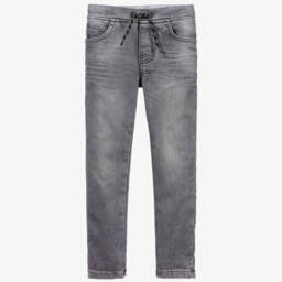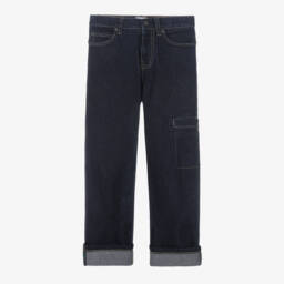 Cute blue jeans for baby boys, by Timberland. Made from cotton jersey, they have the look of denim with the comfort of cotton jersey. With an elasticated waistband, they have a white boot logo print on the back, and the brand's logo in white on the front by the cuff.