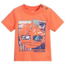 Younger boys grey marl jersey T-shirt by Timberland. Made in super soft organic cotton, it has a red and green logo print on the front, with useful popper fastenings on one shoulder.