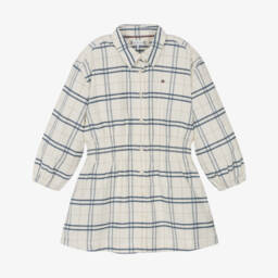 Navy blue and white striped dress for baby girls by American designer Tommy Hilfiger, with the signature flag logo embroidered on the chest. Beautifully soft and comfortable, it is made in cotton jersey and is simply styled with turn-over cuffs and gathers from the bodice. There are popper fastenings on the back to help with dressing.