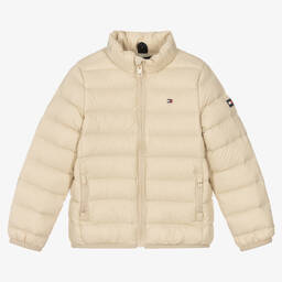 Beige logo tracksuit for junior boys by Tommy Hilfiger, crafted from soft cotton jersey for comfort. The sweatshirt features a navy blue logo print and convenient popper fastenings on one shoulder. Joggers include side seam pockets, a back patch pocket, and a tricolour drawstring on the elastic waistband. Both pieces are adorned with the signature flag logo, offering a stylish finish. Limited quantities available, so secure this cosy and versatile outfit today.