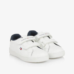 Navy blue trainers by Tommy Hilfiger, for boys. These trainers are made in smooth faux leather, with a fabric lining and a padded insole for comfort. They have double velcro straps for easy fastening and non-slip rubber outer soles. For instant brand recognition, there are tricolour flag logos on the side and heel, with a spellout logo on the top strap.