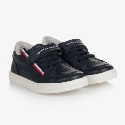 Boys white trainers from Tommy Hilfiger, with a navy blue logo print and signature flag logo details. They have a faux leather outer made of recycled polyester and a soft grey jersey lining. The jersey inner sole is lightly padded and the outer sole is non-slip rubber. There are elasticated laces and a velcro fastening strap over the foot.