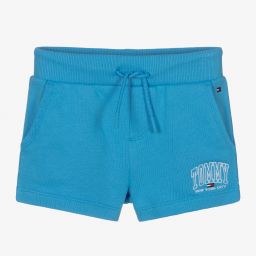 Girls navy blue casual shorts by American designer Tommy Hilfiger, made from organic cotton sweatshirt jersey. In a varsity style, they have a ribbed waist with adjustable drawstring and side pockets. There is a white logo embroidered on one leg together with the iconic red, white and navy blue logo.