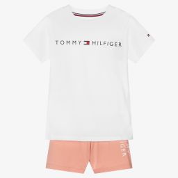 White and pink pyjamas for girls by American brand Tommy Hilfiger, made in soft cotton jersey. The white tee is embroidered with the signature flag logo on the chest, in signature navy blue, red and white colours. It pairs with pink stretchy shorts with a logo waistband, completing the stylish bedtime set.
