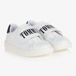 White low-rise sneakers for girls by Tommy Hilfiger. They have pastel pink and white velcro fastening straps, one with logo branding and a flag logo at the side. They have a textile lining and a non-slip rubber outer sole. Made with at least 50% recycled polyester.