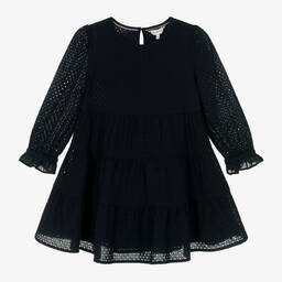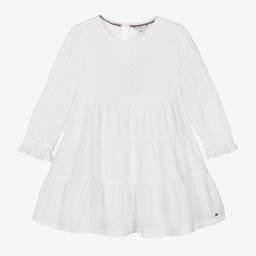 Teen girls white cotton broderie anglaise dress by Tommy Hilfiger, featuring the iconic flag logo plate on the front hem for a touch of subtle branding. Perfect for both casual and smart occasions, it showcases a charming circle pattern and a comfortable voile lining. The dress boasts long puffed sleeves, a tiered skirt, and a stylish keyhole fastening at the back. Limited quantities available – last chance to buy.
