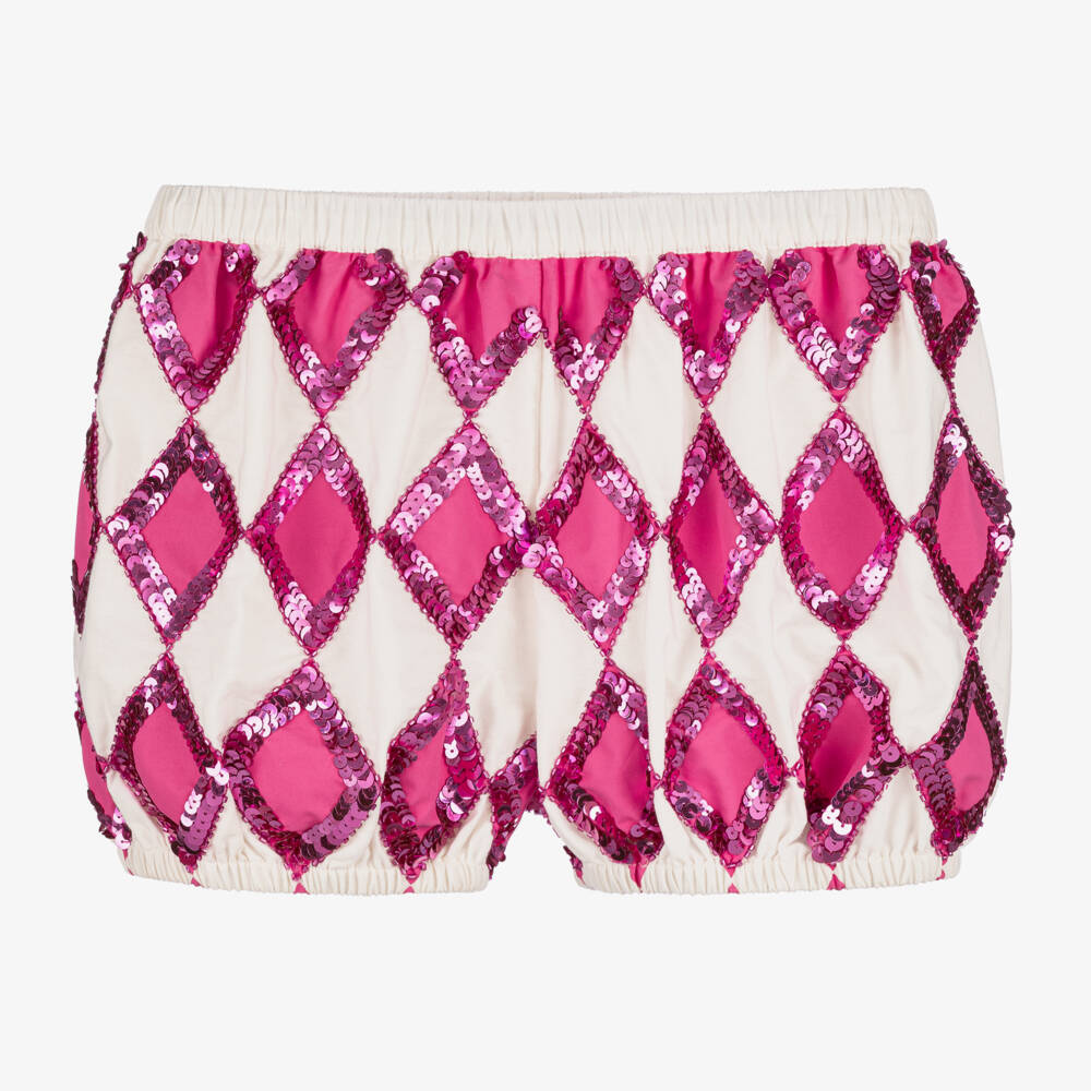 Girls pink and white sequin shorts by Tutu du Monde, crafted in soft cotton poplin with a striking diamond pattern. The shimmering sequins add a touch of glamour, while the lightweight voile lining offers comfort. With an easy pull-up style, they are suitable for playful dress-up occasions. Limited quantities available, so don't miss this last chance to buy.
