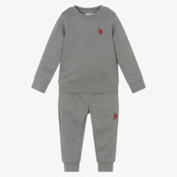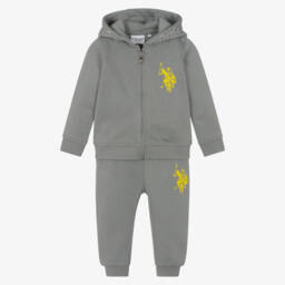 Casual and comfy for little boys, this navy blue hooded tracksuit is by U.S. Polo Assn.. It is made in soft cotton-blend jersey and has a warm fleecy inside. The zip-up top has the brand's signature double horseman logo printed on the chest, with pouch pockets on the front. The joggers have an elasticated waist with a faux drawstring, and side seam pockets.