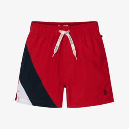 Navy blue swim shorts for boys by U.S. Polo Assn., with a red double horseman logo pattern. Silky and lightweight, they have a comfortable mesh lining and a branded drawstring waistband. There are useful side pockets and a velcro-closing pocket on the back.