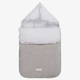 Pale grey baby nest for boys and girls by Spanish brand Uzturre. Softly padded, it is made in soft, organic cotton cheesecloth with a white poplin lining patterned with grey hot air ballooons. This cross-over style has beige velvet ribbon ties at the side and a zip fastening along the bottom, with the designer's brown logo tab. There are openings on the back for attaching to a stroller or car seat.