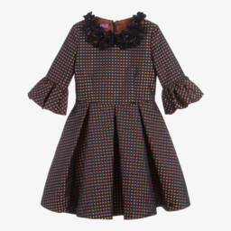 A charming dark blue dress by Valmax with a gathered dropped waisted skirt. It is made in a lightweight stretchy velour with an embroidered tulle panel over the front bodice. It is fully lined and has a stiffened petticoat to give the skirt extra volume.