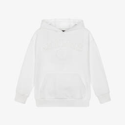 Black hoodie for older boys by luxury Italian brand Versace, with statement pin and logo graphics on the front. Casual and comfortable, it is made in mid-weight cotton jersey with a warm, fleecy inside, a pouch pocket and cosy ribbed trims.