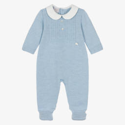 Pale blue cotton jersey babygrow for boys by Italian luxury brand, Versace. It has an eye-catching gold foil print of the brand's iconic Medusa on the front and a rounded collar for a classic look. It fastens with logo embossed gold popper fastenings on the back and between the legs. It comes with a matching double layer hat, which is printed with the brand's logo to complete the look.