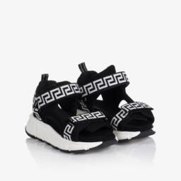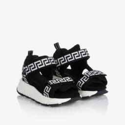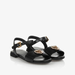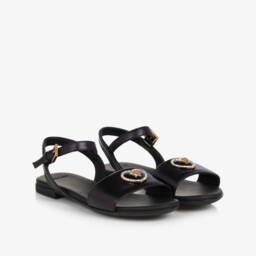 Black silk satin sandals for girls by luxury Italian brand Versace. The foot straps are beautifully embellished with silver diamantés and detailed with a gold-tone Medusa head plaque for a statement look. The ankle stap is comfortably lined in soft and supple leather and trimmed with a gold Greca-embossed buckle. Set on a chunky midsole, they have non-slip rubber soles with a deep tread for traction.