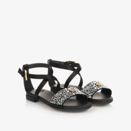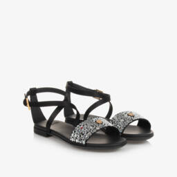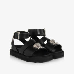 Black silk satin sandals for girls by luxury Italian brand Versace. The foot straps are beautifully embellished with silver diamantés and detailed with a gold-tone Medusa head plaque for a statement look. The ankle stap is comfortably lined in soft and supple leather and trimmed with a gold Greca-embossed buckle. Set on a chunky midsole, they have non-slip rubber soles with a deep tread for traction.