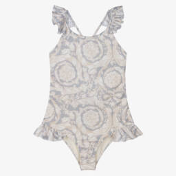 So pretty for little girls, this pink and white Orchid print swimsuit is by luxury Italian brand, Versace. It is patterned with eye-catching Versace logo and contrasting lime green Orchids. Silky smooth and stretchy with lovely ruffle details, it has adjustable criss cross straps on the scooped back and full lining for comfort.