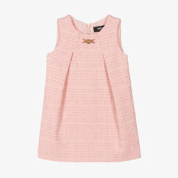 The girls pink fleece barocco skirt dress by Versace for girls combines elegance with comfort. Featuring a soft cotton blend jersey top with an embroidered Medusa logo, it offers a luxurious touch. The pleated skirt, crafted from silky twill, showcases the iconic Barocco pattern. Perfect for spring and summer outings, this dress is a must-have in limited quantities. The zip fastening ensures easy wear, making it an ideal choice for stylish young wardrobes.