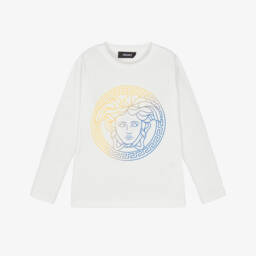 The ivory teddy bear long sleeve top by Versace is crafted in soft cotton jersey, showcasing the brand's signature playful elegance. With a charming teddy bear and logo detail, this top combines comfort with a touch of whimsy, making it ideal for spring and summer wear. Perfect for junior boys, it offers warmth and cosiness, while its easy-care design ensures it remains a wardrobe favourite. Limited quantities available, so don't miss this last chance to buy.