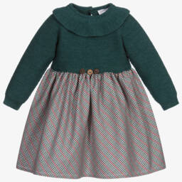 Sweet ivory sleeveless dress for baby girls by Wedoble, with a dainty pink and green floral print. Made and lined in lightweight cotton, it has pretty ruffles over the shoulders and a mother-of-pearl logo charm on the gathered waistline. The dress fastens with a zip on the back.