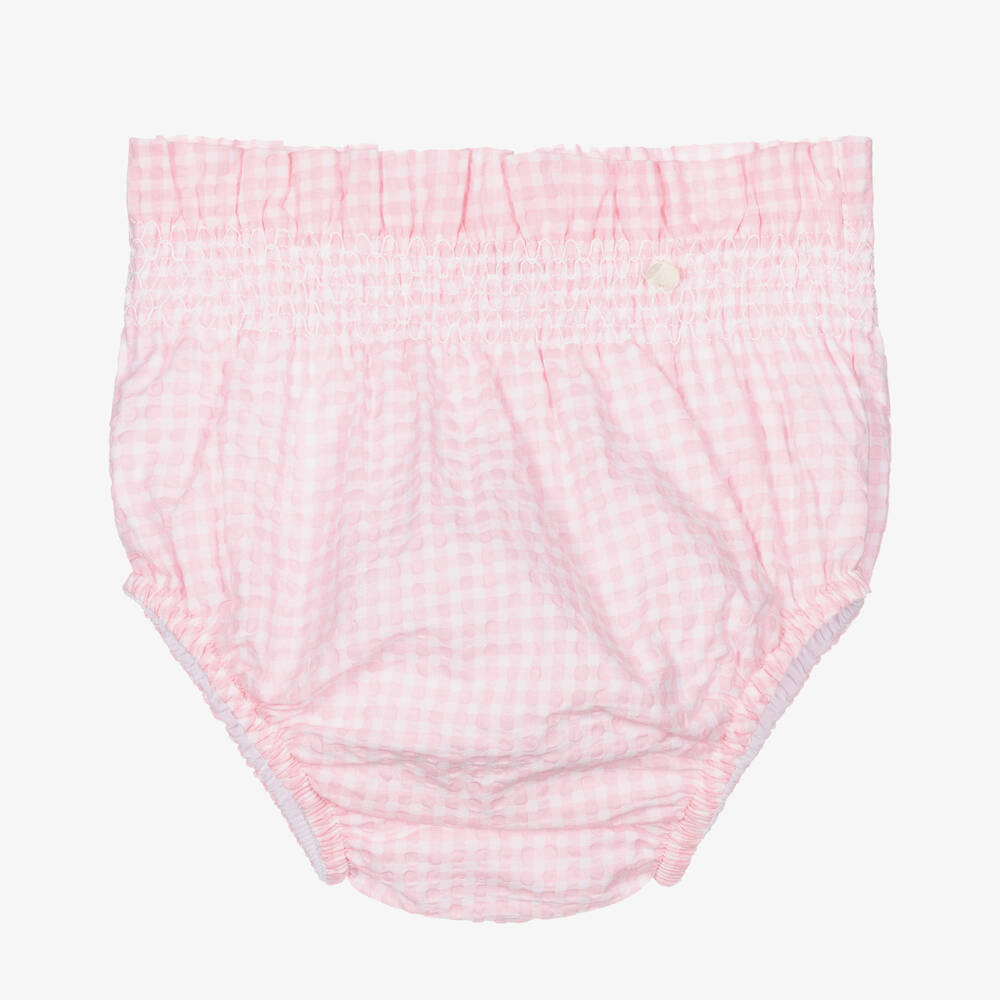 Lightweight cotton bloomer shorts for baby girls by Wedoble, in pink and white check seersucker. Fully lined, they have a little logo charm on the smocked waistband and gently elasticated leg cuffs.