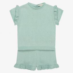 Little girls yellow shorts set by Wedoble, knitted from soft cotton. The top, with a button fastening on the back, has an all-over embroidered circle design and riffle shoulder trims. The cute shorts have matching ruffles on the legs.